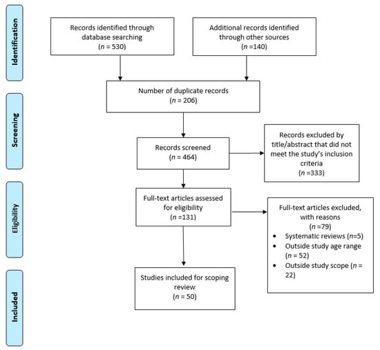 A scoping review was selected for the study methodology because it enables researchers to identify and map key concepts of existing literature of an under-researched and complex topic [11,12,13] Specifically, Munn and colleagues note that the goal of conducting a scoping review is to “provide an overview or map of the evidence” [11] (p. 3) as opposed to a systematic review, which is used to “produce a critically appraised and synthesized result/answer to a particular question” [11] (p. 3). The scoping review methodology was most appropriate for this study because of the dynamic and complex nature of human development during adolescence, the multifaceted healthcare barriers adolescents encounter, and the abundance of literature investigating adolescent health outcomes across several domains.