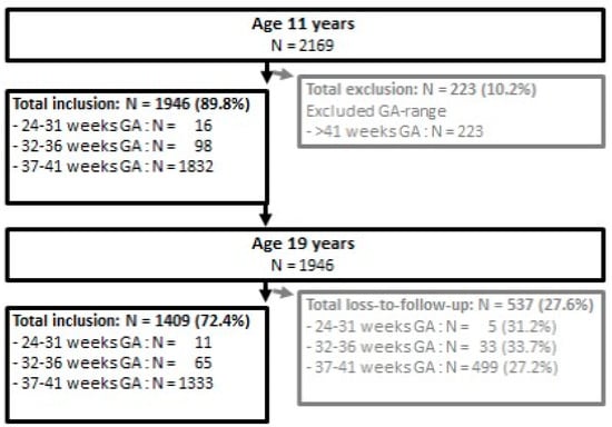 Flow chart of inclusion at age 11, and loss to follow-up between age 11 and 19, stratified by gestational age (GA).