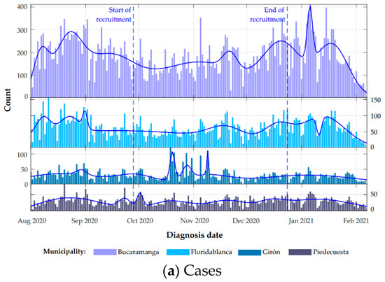 A total of 7045 workers were included in this study, with a greater proportion of women, residents of Bucaramanga, and health workers (Table 1). During the recruitment period, there was no evidence of a peak in the report of new confirmed SARS-CoV-2 cases or deaths in the four municipalities (Figure 1a,b).