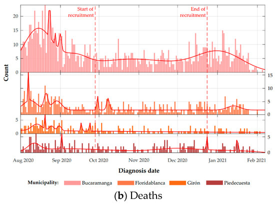 Reported SARS-CoV-2 daily confirmed cases and deaths for the municipalities of the Bucaramanga metropolitan area. (a) New daily confirmed cases, (b) Daily deaths. Dashed lines delimit the frame time in which recruitment was carried out (28 September and 24 December of 2020). Data source: Colombia National Health Institute; https://www.ins.gov.co/Noticias/Paginas/coronavirus-casos.aspx (accessed on 20 March 2021).