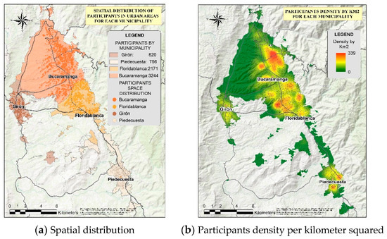 The highest participation was concentrated in Bucaramanga, followed by Floridablanca, Piedecuesta, and Girón (Figure 2a). Figure 2b shows the density map that identifies city areas with the highest number of participants located in urban area per kilometer squared in each municipality; a higher concentration of participation is shown in Bucaramanga, specifically toward the east of the municipality, while in Girón, participants were more dispersed.