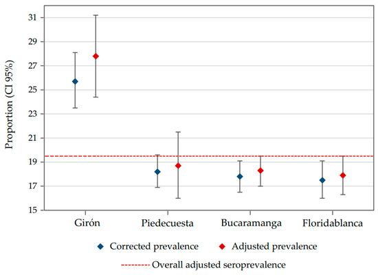 Our estimate of general seroprevalence (19.8%) is lower than the estimates reported thus far for other studies conducted in Colombia and is very close to those reported for other countries such as Iran (22.16; 95% CI: 18.7–26.0) [30]. However, this difference could be related to the type of population included, given that in our study, we included subjects only over 18 years of age that reside and work (occupational sectors) in the previously mentioned municipalities, and that in Estudio Pais, Bucaramanga was the only city included, while in our study, the metropolitan area constituted by three other municipalities was evaluated.