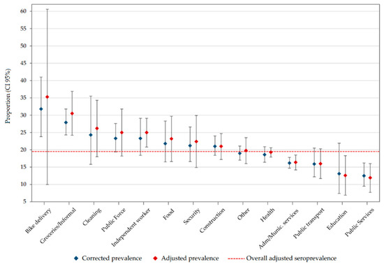 Seroprevalence according to occupational group. Dashed line represents the overall adjusted seroprevalence estimated in our study. This line was added for comparison purposes.