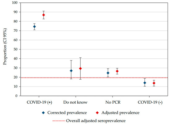 Seroprevalence according to self-reported COVID-19 previous diagnosis. Dashed line represents the overall adjusted seroprevalence estimated in our study. This line was added for comparison purposes.