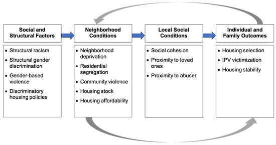 Housing is a social determinant of health []. The complex determinants of safety and housing selection result from structural racism and discrimination that impact neighborhood-level factors and social conditions (outlined in Figure 1). These broader factors contribute to “concentration effects [],” where factors like deprivation and segregation reinforce racial and gender inequity []. Neighborhood deprivation and residential segregation, particularly among Black women [,,], are associated with pre-pregnancy weight and gestational weight gain [,], hypertensive disorder during pregnancy [], and perinatal mortality []. Residential segregation has also been associated with adverse birth outcomes among Black women, including preterm birth and low birth weight [,]. For women who survive IPV, such influences may increase their risk of violence, undermine social cohesion, and impact where they live [,].