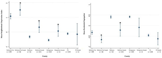 Overall, survivors were re-housed in more deprived and more segregated census tracts when compared to the mean NDI and residential segregation of their respective regions (Figure 2). Survivors in Baltimore City (n = 34) lived in census tracts with the greatest deprivation (M = 1.50, SD = 1.09) and greatest level of residential segregation (M = −0.66, SD = 0.43) (Figure 2). Specifically, the mean NDI of survivors’ census tracts in Baltimore City, Baltimore County, and Montgomery County were significantly more deprived than the mean NDI of their respective regions. Mean NDI did not differ significantly between Prince George’s (PG) County and the census tracts with survivors in that region. Similarly, the mean residential segregation score was significantly different for survivors in Baltimore City and Baltimore County relative to the mean residential segregation in these respective areas; survivors lived in areas with a higher concentration of Black residents relative to White.