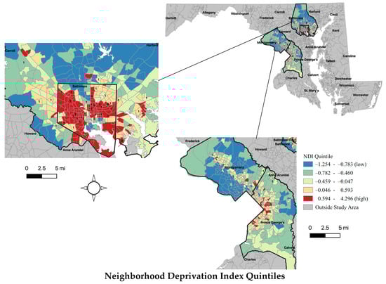 T-tests assessed mean NDI and residential segregation for the four regions of interest versus the study sample present in each of the respective geographic areas (Figure 2). These comparisons are displayed using forest plots. Finally, choropleth maps show the NDI and residential segregation quintiles across the regions and capture the distribution of study survivors (Figure 3). The maps were created using QGIS3.10 software [], using the projected coordinate reference system (CRS) WGS 84/UTM Zone 18N. The county and census tract boundaries were downloaded from the Maryland state government’s publicly available data repository (MD iMAP) [,]. All statistical analyses were carried out in Stata/MP 15.1 [].