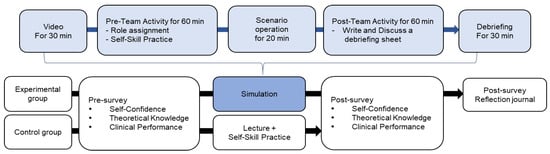 The simulation was conducted in the university’s high-fidelity patient simulation training center, and data were collected from November 27 through 14 December 2018. A one-week gap in the pre- and post-study evaluations of the control and the experimental group were done to prevent diffusion. The detailed study process is shown in Figure 1.