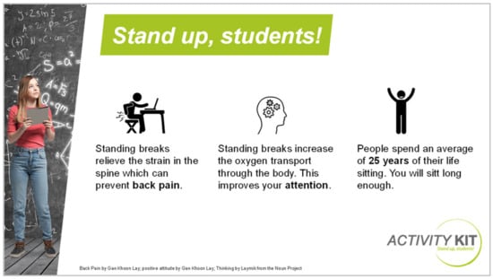 Overall, the standing break was highly accepted by the university students. Likewise, many lecturers were open to the idea of standing breaks. More than half of the students participating in standing breaks reported that they also interrupt sitting more often during learning in the library, at home or in the office, as well as during train rides. However, only less than a quarter of the active break group do this, possibly as they may always associate a break from sitting with exercises rather than a simple standing break. This result highlights the potential that simple changes in conditions in university lectures can also influence students’ behavior off campus. Considering comparable positive results of active and standing breaks together with the easiness of the implementation of the standing break and the fact that students export it off campus supports the implementation of standing breaks in university lectures.