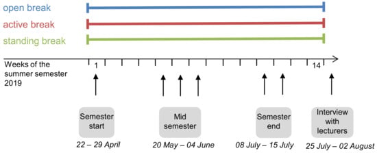 The intervention took place in the summer semester of 2019 (from April to July) with the aim of implementing and evaluating standing breaks in university lectures. In order to find lecturers to participate in the study, e-mails were sent to various faculties at the university. As a result, the intervention was implemented in five lectures which took place once a week for one semester (14 weeks). Table 1 shows the participating lectures. The lectures differed in size while attendance also differed from one week to the next, as attendance was not mandatory and attendance lists were not recorded. The break was initiated each week by the lecturer at approximately half of the 90-min lecture by introducing a presentation slide about the advantages of standing into his or her presentation, which had been designed to encourage standing (see Figure 1). In order to explicitly investigate the effect of standing during the break, two further lectures were included in the study, both on the larger end of the scale. In one lecture for up to 303 students, five-minute active breaks with exercises for strengthening coordination, mobilization, and relaxation were introduced by a sports student while students in the other lecture for up to 760 students had an open break, with no trigger to stand or to be active. Five of the lectures took place in the largest lecture halls of the university, with up to 760 seats in fixed narrow rows. Two of the lectures were held in rooms for 20 and 90 students with moveable rows of chairs and tables. Table 2 provides an overview of the study groups.