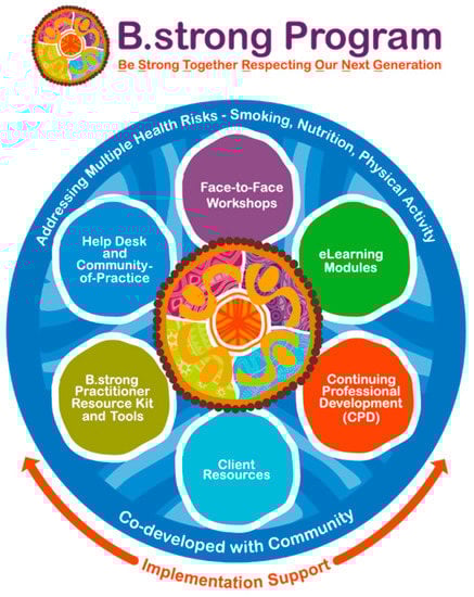 - B.strong content. Workshops: overview of cultural safety and security; overview of impact of smoking, poor nutrition and physical inactivity; behaviour change theory, motivational interviewing techniques and application; brief intervention delivery; reinforcing links to key public health messages; and information regarding relevant government and non-government programs and resources. Six online modules: (1) B.strong Introduction; (2) B.strong Essentials; (3) Quit for Health; (4) Eat for Health; (5) Move for Health; (6) B.strong in Practice. Practitioner resources: practitioner kit, handbooks, guides, community mapping tools. Client resources: Indigenous specific client brochures relating to stages-of-change.
