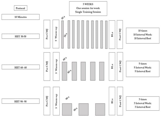 The 3 protocols of the intervention consisted of a HIIT session of 30, 60, and 90 s, respectively. The 3 protocols held the same 1: 1 density, passive rest, and total duration of 10 min. An electronically controlled cycle ergometer (Technogym Bike Med Technogym SpA, Cesena, Italy) was employed, with a workload mode independent of pedaling frequency [14]. In all protocols, subjects had to self-select their exercise intensity in response to a prescription of “effort maximum interval and session” [14]. Participants were instructed to remain seated on the cycle ergometer during the test.