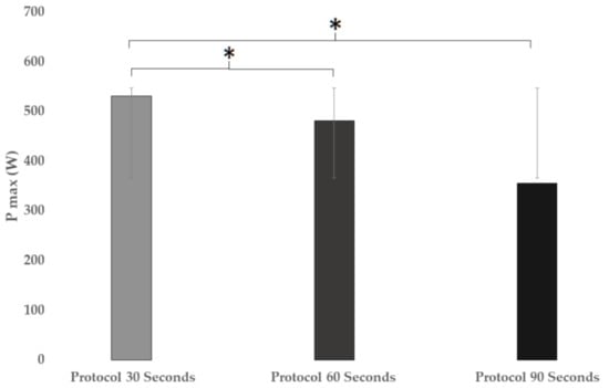 Regarding the power developed during the 3 protocols (see Figure 2), significant differences were found in the maximum power (F = 9.237; p < 0.001; ηp2 = 0.227). In the comparison between the protocols, there were significant differences between the 30 s vs. 90 s groups (p < 0.001) of the multiple comparison (p < 0.001; ηp2 = 0.227; 95% CI = (74.7252–277.5475)). There were also significant differences between the 90 s vs. 60 s protocols (p = 0.011; ηp2 = 0.227; 95% CI = (−227.7293–−24.9071).