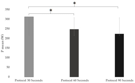 In the mean power (Figure 3), significant differences were found when the three protocols were compared (F = 14.926; p < 0.001; ηp2 = 0.322). In the comparison between the protocols, significant differences were found between groups 30 and 60 s (p = 0.001) of the multiple comparison (p < 0.001; ηp2 = 0.322; 95% CI = (24.7917–105.9356)) and between protocols 30 and 90 s (p < 0.001) of the multiple comparison (p < 0.001; ηp2 = 0.322; CI95% = (48.6098–129.7538)).