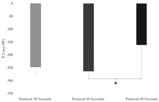 In the variable of lost power (Figure 4), significant differences were found when the three protocols were compared (F = 3.217; p = 0.047; ηp2 = 0.093). In the comparison between the protocols, there was a significant difference between 60 and 90 s protocols (p = 0.045 *) of the multiple comparison (p = 0.047 *; ηp2 = 0.093; 95% CI = (−205.6400–1.4582).