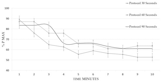 Regarding Figure 5, the % of the maximum power developed, significant differences were found when comparing the three protocols (F = 7.991; p = 0.001; ηp2 = 0.202). Such comparison manifested a significant difference between the 30 and 90 s protocols (p = 0.001 *) of the multiple comparison (p = 0.001 *; ηp2 = 0.202; 95% CI = (0.0601–0.2417)).
