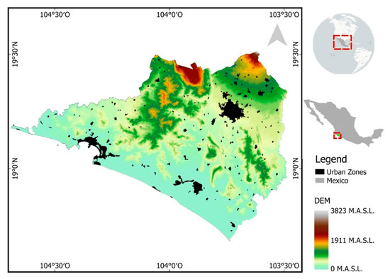 Colima is one of the 32 provinces of Mexico and is located in the western part of the country. Colima’s total area is about 5625 km2. In terms of climate, the wet season extends from June to November, whereas the dry season is from December to May. Colima has a mountainous landscape in the north, where the Colima Volcano is the highest area, but no urban settlements are near this active mountain (Figure 1).