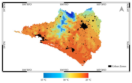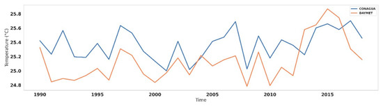 The mean average temperature map from Colima 1 January 1990 to 31 December 2018 is shown below in Figure 2. It can be observed that average temperature experiences a gradient between 13 and 25 °C in Colima. A decrease in temperature can be identified towards the north, where the Colima volcano’s foothills are located and to the northwest, where the biosphere reserve of the Sierra de Manantlan is located. It is important to note that the most significant urban centers in the state are located in areas where the average annual temperature is above 23 °C. Figure 3 presents a median temperature over the years of CONAGUA and DAYMET. The temperature data analysis allows us to identify that the DAYMET 3V data can adequately reproduce the behavior of the data recorded at the CONAGUA surface weather stations. An apparent increase can also be observed in the last decade in the average annual temperature. This statistic results from more and more days during the dry season when the maximum daily temperatures are above 30 °C. CONAGUA’s temperature sensors are generally installed at 1.50 m from the surface, so this may be a parameter that affects when compared with DAYMET records generated from information at automatic stations, in which the sensor is located at a higher altitude.