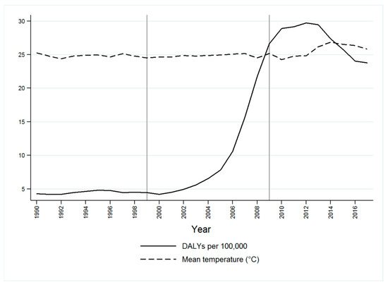 Disability-adjusted life years (DALYs) due to dengue among school-aged children and mean temperatures (°C) in urban areas from Colima, Mexico, 1990–2017.