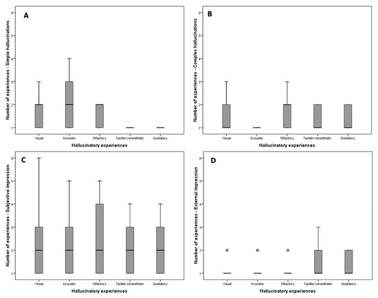 Frequency of individual hallucinations according to whether they are simple (A) or complex (B), or according to the impression: subjective (C) or external (D) (° = outliers).