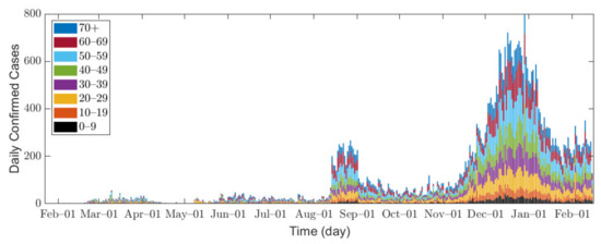 In this research, we used data of confirmed COVID-19 cases in Seoul and Gyeonggi Province between 1 February 2020 and 14 February 2021 [32,33]. Because the data for Seoul are provided in age groups of 10 years, we combine the data from both Seoul and Gyeonggi Province into 10-year age groups for consistent interpretation, namely 0–9, 10–19, 20–29, 30–39, 40–49, 50–59, 60–69, and 70 or older (70+). Figure 1 shows the epidemic curve of confirmed COVID-19 cases, and Table 2 shows the total number of confirmed cases for each age group in Seoul/Gyeonggi area.