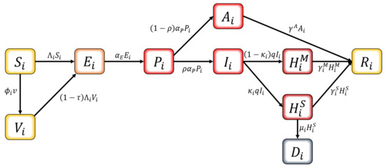 We developed an age-structured mathematical model to describe the transmission dynamics of COVID-19 with vaccination. In this model, the population is separated into compartments based on their characteristics for each age group : , , , , , , hospitalized with mild symptoms, hospitalized with severe symptoms, and . The age classes represent individuals aged 0–9, 10–19, 20–29, 30–39, 40–49, 50–59, 60–69, and 70+, respectively. The schematic diagram of the model is shown in Figure 2. The susceptible population can be vaccinated or become infected. Infection can occur for both the susceptible and the vaccinated if pre-symptomatically, asymptomatically, or symptomatically infectious population makes contact. Once considered infected, this population is exposed and becomes pre-symptomatically infectious after the latent period. The pre-symptomatically infectious population does not show any symptom and moves on to either asymptomatically infectious or symptomatically infectious. The asymptomatically infectious population continues to show no symptoms; thus, no isolation is made until they become recovered. On the other hand, the symptomatically infectious population will be hospitalized based on the severity of their symptoms—either mild or severe—once they are confirmed with COVID-19. The hospitalized population is completely prohibited from making contacts with others. Both hospitalized groups recover, except for those who die from a group with severe symptoms.