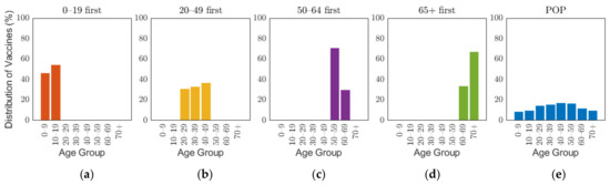 Distribution of vaccine scenarios for five prioritization strategies: (a) 0–19 first, (b) 20–49 first, (c) 50–64 first, (d) over 65 first, and (e) proportion of population (POP).