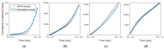 We estimated the infection probability of each age group under different levels of SD in the focus area by fitting the actual data of the confirmed cases by the least squares method. SD is one of the main NPIs implemented in Korea, and it played an important role in preventing a massive increase in the number of incidences and mortalities [36,37,38,39]. The effect of SD was reflected in terms of the contact matrix in our model, and the change in the number of confirmed patients due to direct/indirect effects of SD was used in the estimation of the infection probability. The change in the intensity of SD influenced the magnitude of the infection force, which was proportional to the infection probability and the entries of the contact matrix in the model Equation (1).