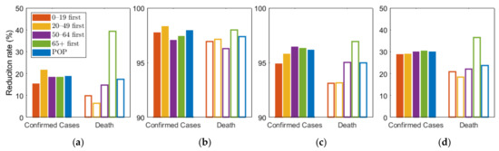 Lastly, we examined the effects of vaccine allocation order on age groups 0–19, 20–49, 50–64, and 65+, where all four groups were vaccinated in succession with 70% coverage. The reduction in cumulative confirmed cases and deaths were tested for 24 different scenarios in each SD level. Depending on SD level, the optimal results varied, but for all SD levels, the optimal vaccination order for reducing deaths started with vaccinating the eldest group 65+.