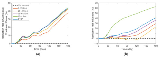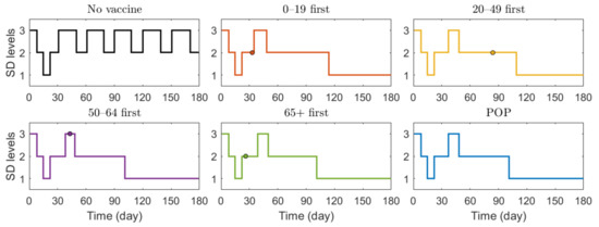 Figure 6 shows that SD level was higher in the case of no vaccination than in other vaccination cases for most of the time, because, as shown in Figure 7, the number of confirmed cases in the case of no vaccination was much larger than that in other cases, making the SD level higher than that in other cases for most of the time. Figure 6 shows that without vaccination, SD level alternates between 2 and 3, while any vaccination strategy will lower the required SD level to 1. Figure 7 shows that reduction in death is substantially effective with strategy “65+ first”, compared with other strategies since vaccination targets the age group with the highest death rate, and any vaccination strategy successfully reduces the cumulative confirmed cases, compared with no vaccination scenario.