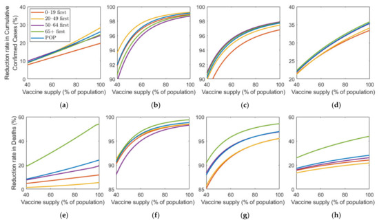Figure 8 shows the effect of vaccine supply on the reduction in cumulative confirmed cases and mortalities for different SD levels. Instead of focusing on the vaccine strategy introduced previously at 70% coverage of the total population, we explored the effects for different vaccination coverages. As vaccine supply varied, we assumed that, in each vaccination priority strategy, vaccine was initially administered to the target age groups by % of the target population and then administered to the other age groups proportionally to their population until % of the total population was vaccinated, where % ranged from 0% to 100%. Similarly, the POP strategy also considered variation in vaccine supply using the same total coverage as that in the other strategies.