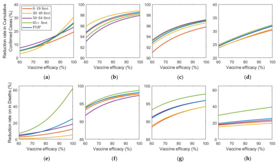 Impact of vaccination efficacy on the reduction in cumulative confirmed cases and deaths for different SD levels: (a,e) 0, (b,f) 1, (c,g) 2, and (d,h) 3.
