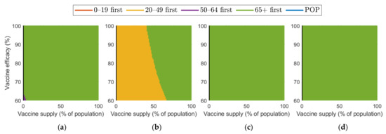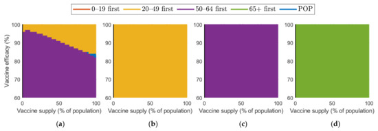 Vaccination priority strategy for the best reduction in cumulative confirmed cases of various vaccination supplies and efficacies under different SD levels: (a) 0, (b) 1, (c) 2, and (d) 3.
