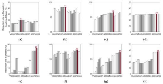 Impact of vaccination allocation scenarios on the reduction in cumulative confirmed cases and deaths for different SD levels: (a,e) 0, (b,f) 1, (c,d) 2, and (d,h) 3.