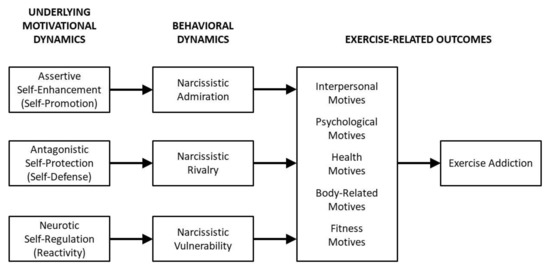 Narcissism has been found to be associated with exercise addiction but the underlying mechanism that is responsible for this connection remains unclear. One possible mechanism may be particular motives that are related to exercise. This possibility is consistent with previous arguments that motivational factors may mediate the associations that personality traits have with a wide array of attitudes and behaviors [43]. The basic idea is that personality traits may activate motives that are then satisfied by adopting certain attitudes or engaging in particular behaviors. Support for the argument that personality traits are associated with various motives for participating in activities has been observed for a range of behaviors including exercise [44,45,46,47]. Furthermore, exercise-related motives have been found to mediate the associations that basic personality dimensions have with exercise-related behaviors [47]. For example, neuroticism was found to be associated with motives concerning the improvement of appearance and regulation of weight which, in turn, were associated with engagement in exercise. Exercise-related motives have also been shown to be associated with exercise addiction [48,49,50,51] but no studies have examined whether the associations between narcissism and exercise addiction are mediated by exercise-related motives.