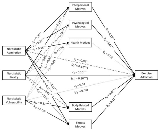 The results of the parallel multiple mediation analyses with the exercise-related motives mediating the associations that narcissistic admiration, narcissistic rivalry, and narcissistic vulnerability had with exercise addiction. Note: The total effects (i.e., c1′, c2′, and c3′) are presented in parentheses. The significant positive associations are indicated by solid black arrows. The significant negative associations are indicated by dashed black arrows. The dotted gray lines represent nonsignificant associations. * p < 0.05; ** p < 0.01; *** p < 0.001.