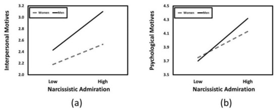 Predicted values illustrating the interaction of narcissistic admiration (at values that are one standard deviation above and below its mean) and gender for interpersonal motives (a) and psychological motives (b).