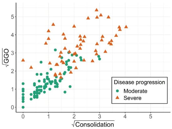 COVID-19 study: scatterplot of the square roots of GGO and consolidation by severity of COVID-19 disease progression.