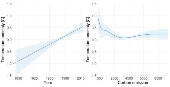 In Figure 2, the slopes of both time series reveal a sharply increasing trend from the 1950s onwards. In contrast to the fairly smooth time series of carbon emissions, temperature anomalies exhibit severe annual fluctuations. The correlation coefficient between carbon emissions and year is 0.93 and indicates a strong linear relationship. The corresponding VIF is 7.071. As stated before, according to Dohoo et al. [] and Tabachnick et al. [], the high correlation between the two independent variables very likely indicates the presence of collinearity and suggests omission of one variable of the pair. Redundancy analysis using generalised additive models suggests the removal of the variable carbon emissions due to a higher adjusted R2 value of 0.988. The estimated R2 of the generalised additive model regressing year on modelled carbon emission was 0.954. Further, the condition number for this example is 303.3, indicating near-dependency.