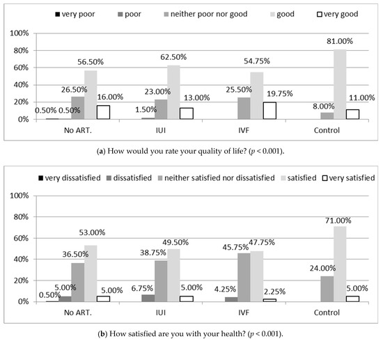The highest percentage of women from the group with confirmed fertility evaluated their quality of life as good or very good (92%), whereas women in the group treated due to infertility significantly less commonly assessed their overall quality of life as good (72.5% of those who received non-ART treatment, 75.5% IUI, and 74.5% IVF), while more frequently as neither poor nor good (p < 0.001), (Figure 1a).
