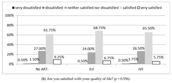General quality of life (a) and health satisfaction (b) according to WHOQOL-BREF in study groups. Chi-square test was used. no ART.—Women treated for infertility without the use of assisted reproductive technology; IUI—intrauterine insemination; IVF—in vitro fertilization; WHOQOL-BREF—Abbreviated World Health Organization Quality of Life questionnaire.