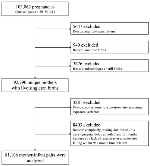 The dataset used in this study, jecs-an-20180131, was released in March and updated in December of 2018, and included measurements for the first and second/third trimester, as well as for 0, 1, 6 and 12 months postpartum. Among the 103,062 participants in this dataset, 5647 were excluded due to multiple registrations, 949 due to multiple births, and 3676 following miscarriages or stillbirths. Among the remaining 92,790 pregnancies with singleton live births, 3281 were excluded due to missing information on exposure variables during pregnancy. Another 8403 pregnancies were further excluded due to a lack of responses to the posted Ages and Stages Questionnaire®, Third Edition (ASQ-3) [14], both at 6 and 12 months postpartum. Thus, data from 81,106 mother-child pairs were analyzed (Figure 1).