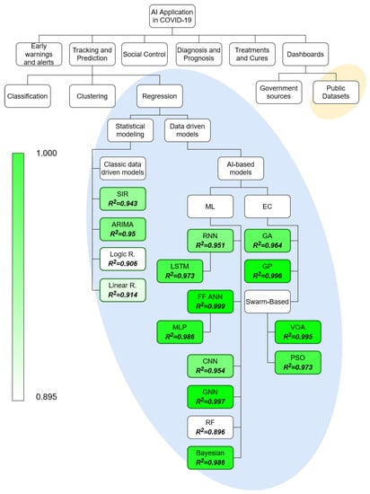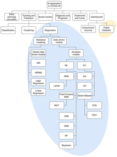 The field of AI application in COVID-19 is vast and it may be split into multiple subfields [29]. To make the focus of the paper more apparent, and illustrate the topics used in the review, the taxonomy is given in Figure 2. The taxonomy of AI application in COVID-19 is based on previous research in the field [29,31]. The split amongst the methods within the regression field is done according to the established taxonomy of such methods [35,36,37]. The field in which the review has been performed has been marked with the elliptical background elements.