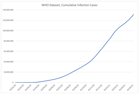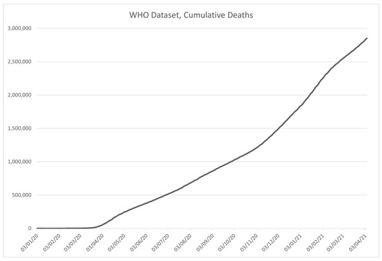 World Health Organization (WHO) is an independent specialized agency of the United Nations, whose task is to help achieve the highest level of health for all people in the world; it is headquartered in Geneva [44]. WHO is responsible for managing global health issues, setting standards, designing health research and development programs, monitoring and assessing health trends, providing technical support to countries, and defining strategic documents based on scientific evidence. On 11 March 2020, the WHO declared COVID-19 as a global pandemic. On the WHO official website is a dashboard with the number of global confirmed cases and deaths, collected daily [45]. These data are official and have high precision. The data may be downloaded in a table format, with data sorted by country in alphabetical order and each country data sorted daily since 3 January 2020. The is separated into columns consisting of:
