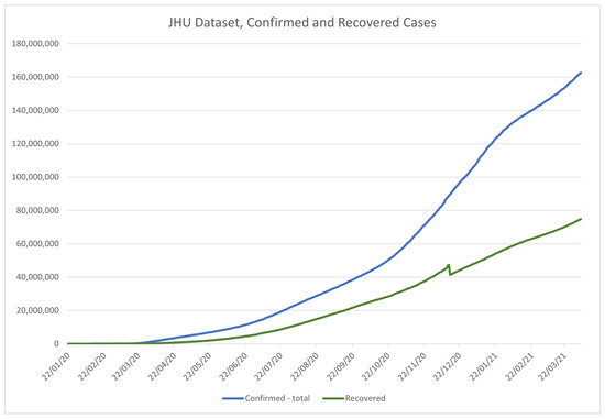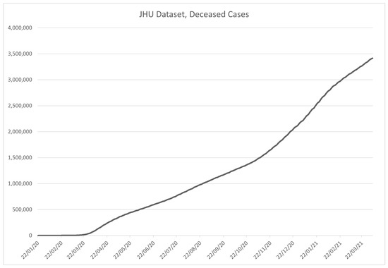 JHU dataset is popular among the researchers for many reasons, including the convenient time-based formatting for each country, regular updates, and precision. As a result of the large amount of data, the dataset has been split into global and US datasets, allowing for more precise, per-county data collection for the US. Figure 5 and Figure 6 show the data from the global dataset of the JHU, in the period from 22 January 2020 to 17 February 2021, for recovered () and confirmed (), and deceased cases (), respectively. The value of the above is that the number of active cases () can be derived from the above data using: