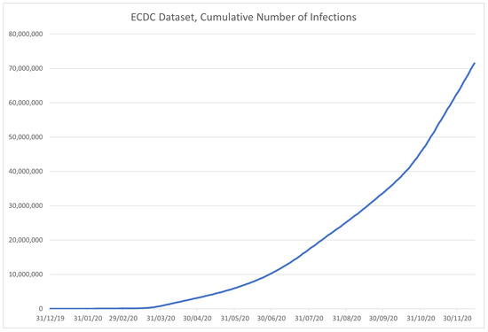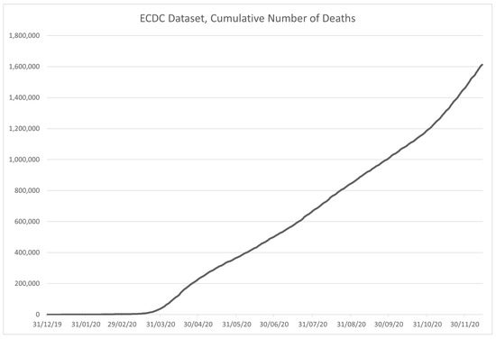 The role of the European Centre for Disease Prevention and Control (ECDC) is to strengthen the European defense against communicable diseases [50]. It provides scientific advice to EU governments and institutions, ensures early detection and analysis of upcoming threats to the EU, it helps EU member state governments prepare for disease outbreaks, analyzes and interprets data obtained from the EU Member States on 52 communicable diseases and conditions. The dataset is available at [51], but it is no longer updated since ECDC has switched to weekly instead of daily reporting since 14 December 2020. The data are sorted by country (column “Countries and territories”-Country), and contain the date—in both formatted and separated formats, along with the number of newly reported cases (C) and deaths (D) for the given date. Along with that information, the dataset contains geoID of the country, country territory code (), population data for the country collected in 2019 (), a continent the country is on, and the cumulative number of COVID-19 cases per 100,000 people in population for 14 days. The example of the data contained in the dataset is given in Table 4, with the data contained in the dataset being shown in Figure 7 for the infected, and in Figure 8 for the deceased patients.