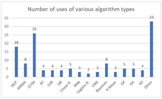 Yudistira [98] demonstrates the use of big data and the Long Short-Term Memory method to learn the correlation of COVID-19 growth rate. As input data, 100 regions (countries/provinces/states) are used for the model training process, while the other 4 countries (Indonesia, Sweden, Saudi Arabia, and Argentina) are used as validation data. Models were trained with the data collected from 22 January 2020, until 1 May 2020. The optimal structure of the models was determined heuristically. For model performance evaluation purposes, the mean squared error and RMSE are utilized. Experimental results show that LSTM outperformed RNN in terms of the RMSE value, therefore it can be used to predict COVID-19 spread. To predict the number of COVID-19 confirmed cases, Vadyala et al. [99] use a combination of LSTM networks, XGBoost, and K-Means. The presented approach is based on combining features of similar days to build an efficient model to forecast COVID-19 cases in Louisiana, USA. Data of COVID-19 cases were collected from the Center for Systems Science and Engineering at JHU, demographic data for the state of Louisiana was obtained from the Louisiana Demographic website, and the weather data were obtained from the National Weather Service website. As a result, the K-Means-LSTM method achieves satisfactory forecasting performance with the RMSE value of 601.20. Ayyoubzadeh et al. [100] use Long Short-Term Memory and linear regression models to estimate the number of positive COVID-19 cases in Iran. The data used in the research were obtained from the Google Trends and Worldometer websites. To achieve robustness of the models, 10-fold cross-validation is utilized, and as performance evaluation criteria, RMSE is used. According to the experimental results, the linear regression model achieves an RMSE value of 7.562 while the LSTM model achieves the RMSE value of 27.187. With more training data, authors believe that the LSTM model can achieve more precise predictions and outperform other ML-based models. Pal et al. [101] propose a shallow Long Short-Term Memory network. As model input data, the number of COVID-19 confirmed, recovered and death cases are used along with the weather data for a specific country. Additionally, a Bayesian optimization framework was performed to optimize country-specific networks. According to the results where the data of 180 countries are used as input, the proposed method outperforms state-of-the-art methods. In the case where a combination of the trend data and weather data are used together as model input, experiments show that the weather data do not have a significant impact on the model predictions. Zhao et al. [102] present curve fitting and various recurrent ANNs, including LSTMs and 10 different types of slim LSTMs to forecast the spread of COVID-19 in the USA. Dataset used to model the spread is publicly available and obtained from the JHU Coronavirus Resource Center. According to the presented results, LSTM RNNs tend to overfit, therefore, to fit the true distribution of COVID-19 input data, curve fitting is a better choice. Additionally, in terms of forecasting the pandemic, LSTM RNNs do not show a significant advantage over the curve fitting. ARIMA along with Nonlinear Autoregression Neural Network (NARNN) and LSTM was used in Kijrbas et al. [103] research for modeling confirmed COVID-19 cases. NARNN is used for time series predictions where an ANN utilizes a certain part of the time series as training data. LSTM is an ML algorithm with RNN architecture. The dataset was obtained from European Center for Disease Prevention and Control and consists of cumulative confirmed case data of eight different countries: Belgium, Denmark, France, Finland, Germany, Switzerland, Turkey, and the United Kingdom. In this research, seven performance metrics were used to identify mathematical differences and fairly besides graphical comparison. From the results, it can be seen that the LSTM model is the most successful for all country data examined.