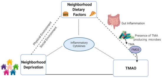Higher deprivation neighborhoods can also influence dietary quality due to limited access to nutritious foods and more access to lower fiber content and higher energy–density foods [24]. Some higher energy-dense foods, such as red and processed meat, contain amine nutrients involved in the endogenous production of the CVD-associated dietary-microbiome metabolite, trimethylamine-N-oxide (TMAO). Specific gut microbiome species metabolize the dietary amine nutrients choline, phosphatidylcholine, and carnitine [24]. These steps produce the TMAO precursor metabolite, trimethylamine (TMA). Trimethylamine is then transported to the liver and converted to TMAO by the hepatic enzyme flavin monooxygenase isoform 3 (FMO3) [25]. Concerning CVD, in vitro studies show that TMAO affects macrophage foam cell formation [25], cholesterol uptake [26], promotes thrombosis [27] and induces the production of inflammatory cytokines linked to atherosclerosis, such as TNF-α [28]. For instance, the Multiethnic Cohort Adiposity Phenotype Study reported that plasma levels of TMAO were related to both precursor dietary nutrients and inflammatory cytokines [29]. Considering the disproportionate cardiometabolic mortality attributable to diet choices among African-Americans [30], identifying microbiome-related markers relevant to diet choices and neighborhoods could lead to developing novel, multilevel interventions for CVD risk reduction.