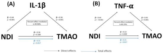 Mediation analysis showed that the inflammatory cytokines, IL-1β and TNF-α, mediated the relationship between NDI and TMAO. IL-1β mediated 49.96% of the relationship between NDI and TMAO (Figure 2A). In comparison, TNF-α mediated 60.15% of the NDI-TMAO relationship (Figure 2B).