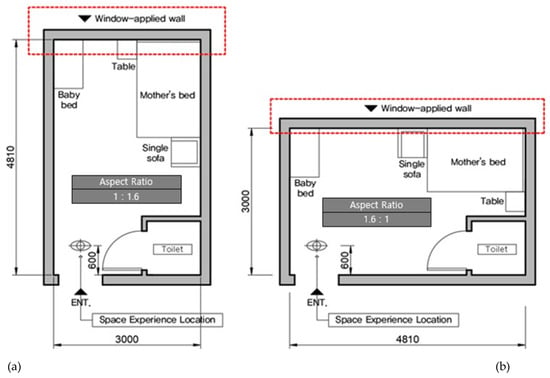 First, the aspect ratio of space means the ratio between the length and the width of a plane. Since architectural or spatial structures carry arithmetic and geometric attributes, proportionality serves as a stimulating factor that leads to the scales of dimensions and shapes or the spatial perception and cognition. Therefore, how people feel about an architectural space may vary with the proportionality between the architectural elements [62]. Indeed, architects will secure highly useful source data when they design buildings, should they first establish whether there are differences in users’ EEG-based responses to longer and wider planes when the areas of both are equal and how they differ. We set up two (Types A and B) aspect ratios of space by referring to the status of real-world postpartum care centers. The aspect ratio of Type A was 1:1.6, where the space was long seen from the door, while the aspect ratio of Type B was 1.6:1, where the space was wide.